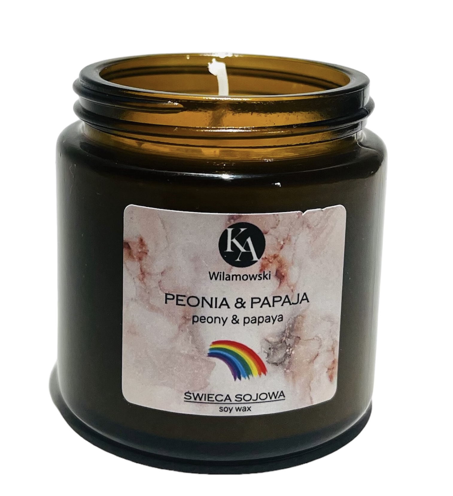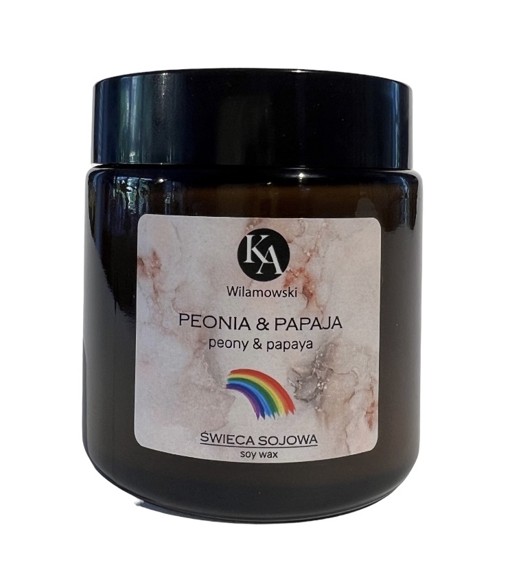 Świeca o zapachu Peonia Papaja, została przygotowana z naturalnego, biodegradowalnego wosku sojowego.