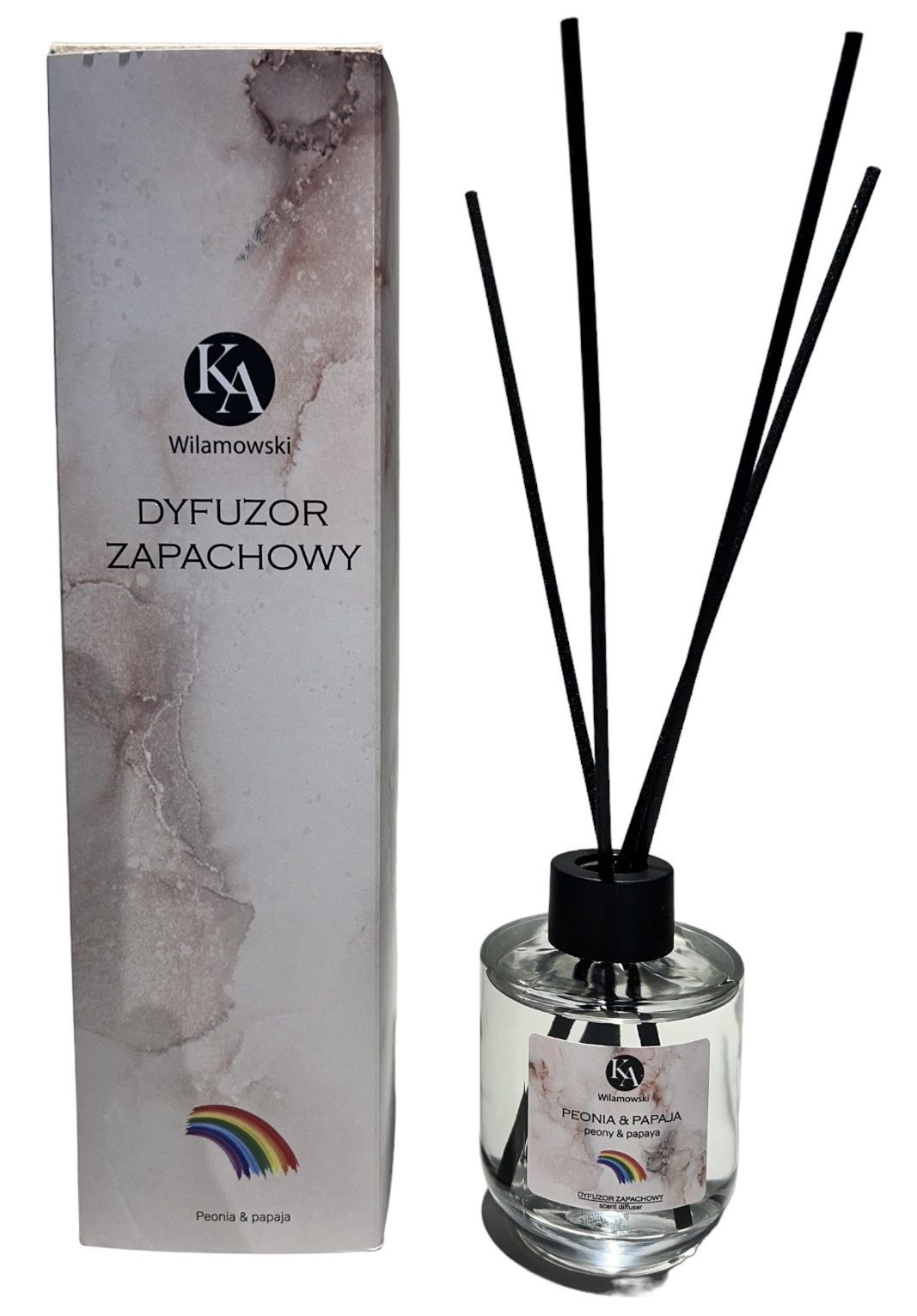 Zmysłowy zapach peoni i papaji zamknięty został w ekskluzywnej butelce. Emituje cudowny aromat dzięki zastosowaniu patyczków zapachowych.