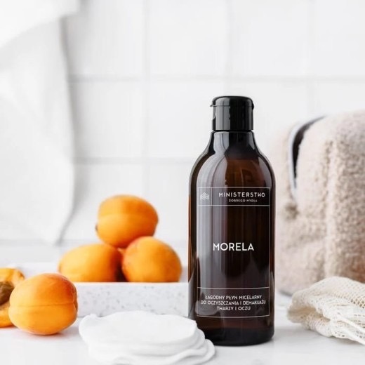 Delikatny, a zarazem skuteczny płyn micelarny z ekstraktem z owoców moreli i fermentem Yerba Santa. Idealny do codziennego stosowania.