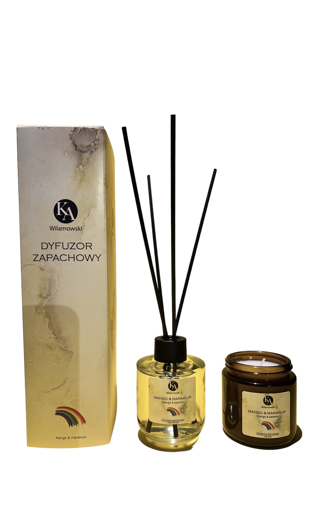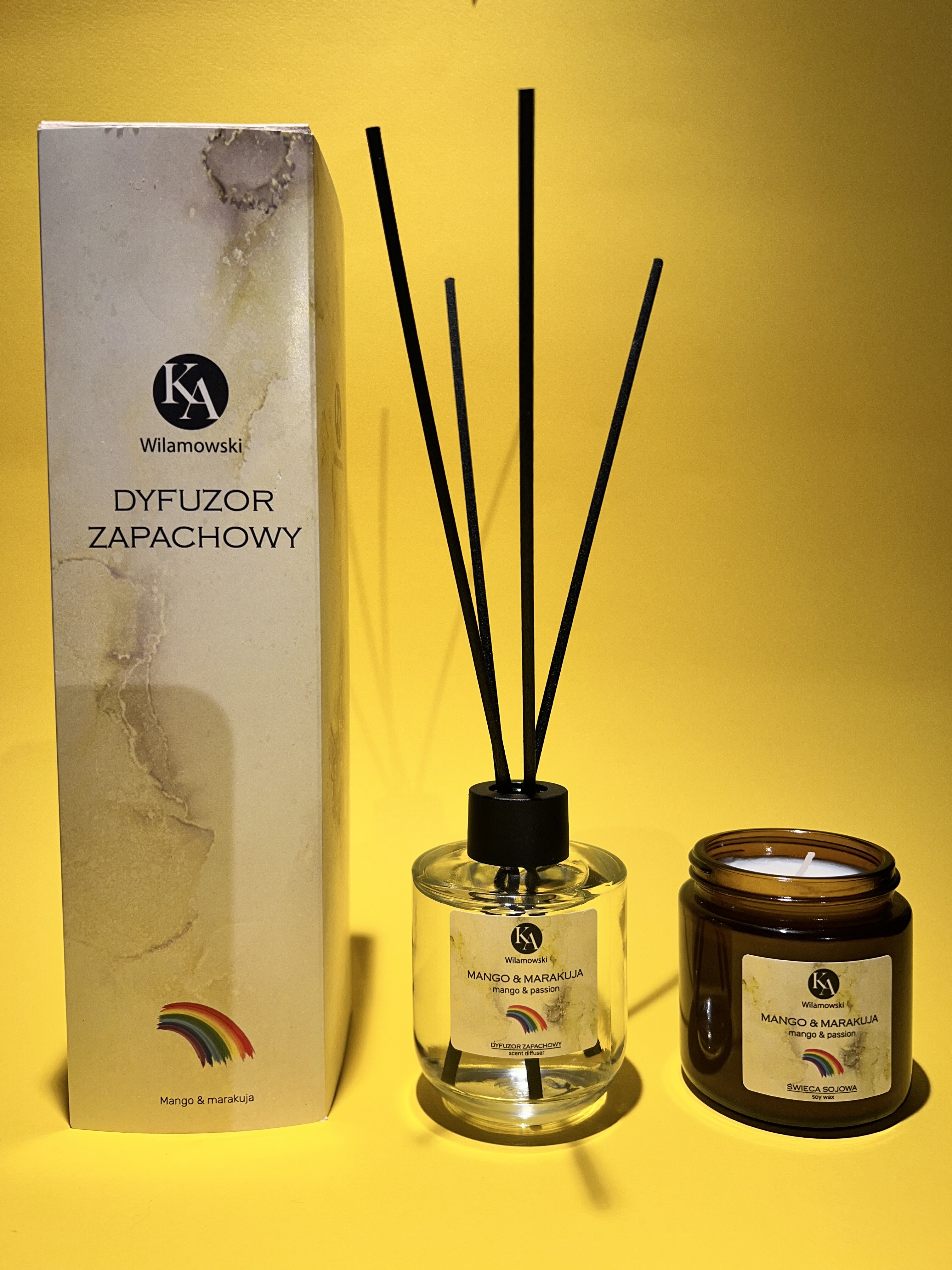 Odkryj nasz uroczy zestaw zapachowy, który obejmuje dyfuzor zapachowy i świecę o aromacie mango i marakui.