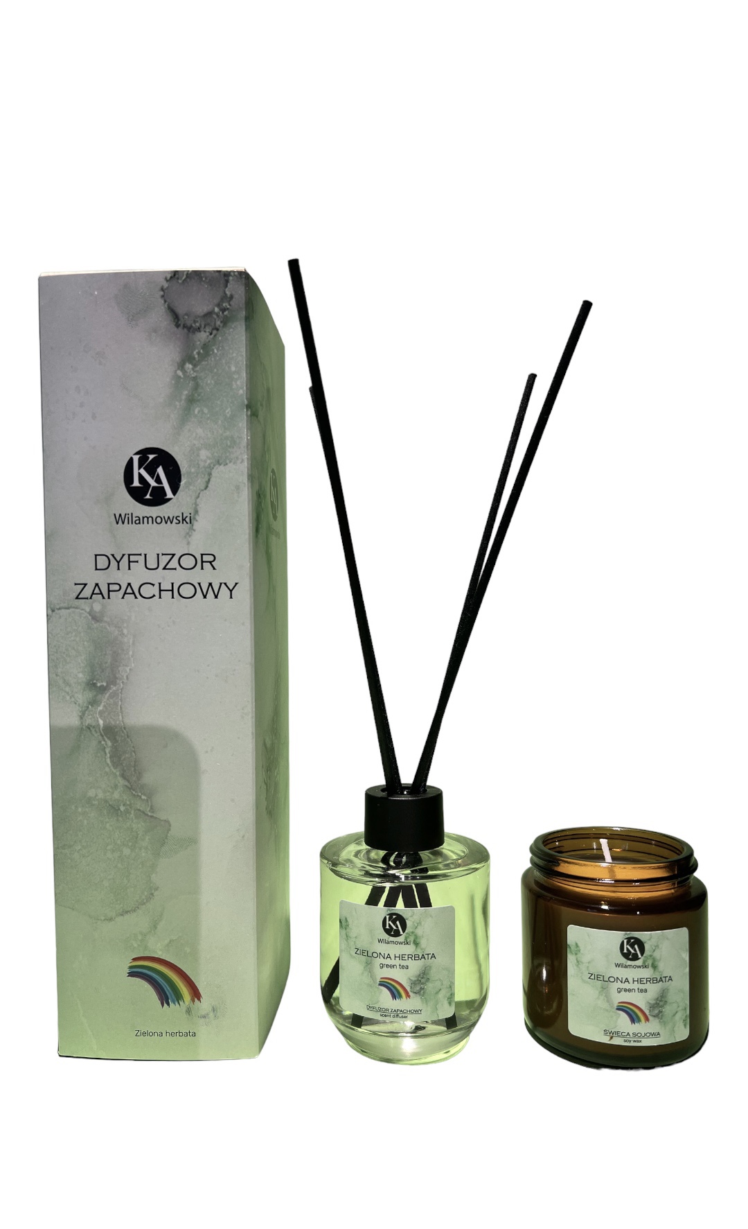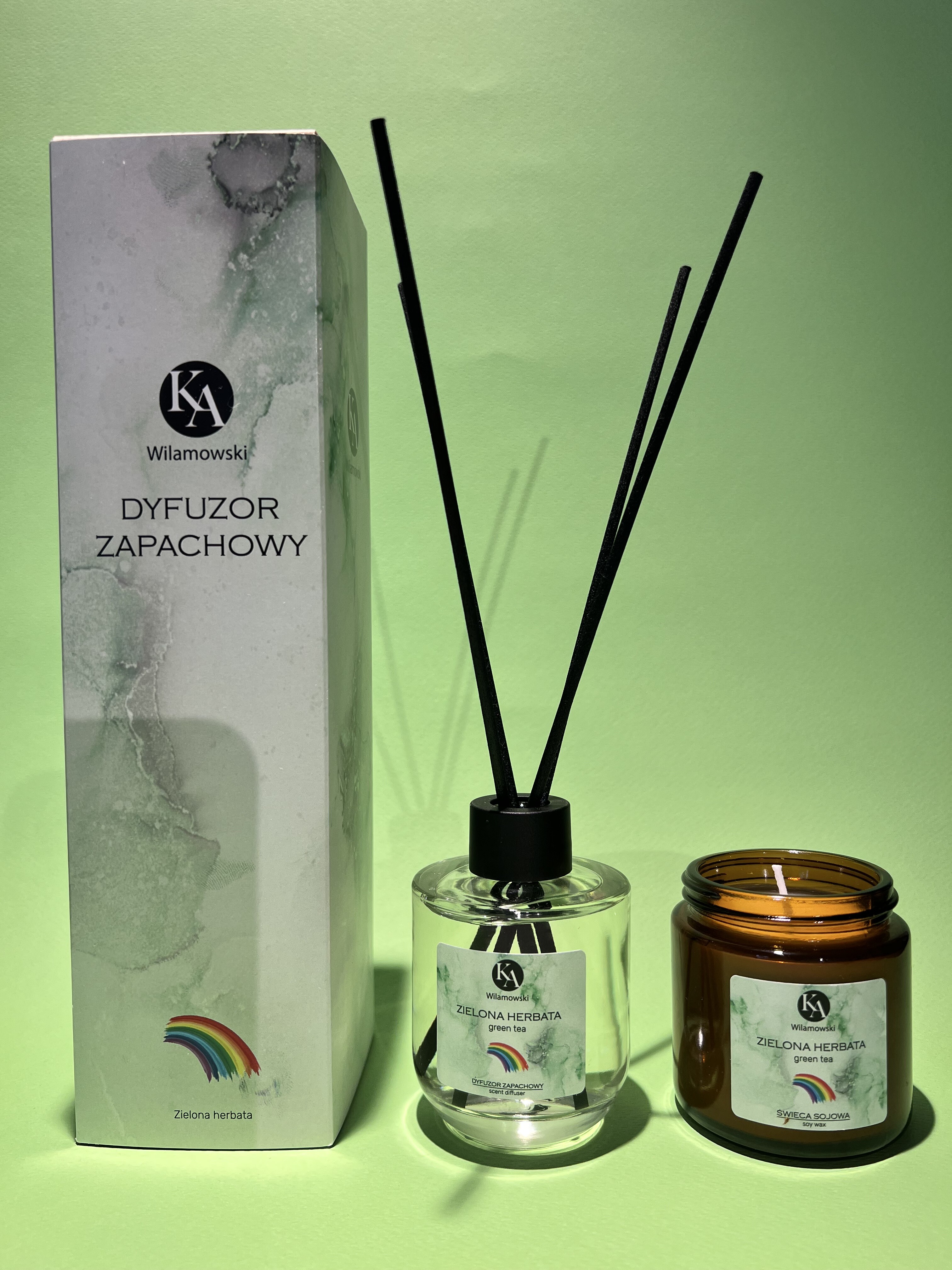 Odkryj nasz uroczy zestaw zapachowy, który obejmuje dyfuzor zapachowy i świecę o zapachu zielonej herbaty.